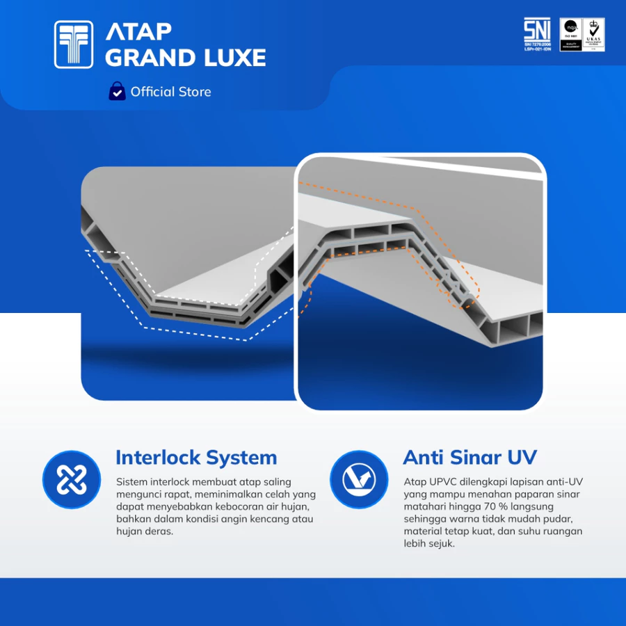 Sedang mencari solusi atap yang tidak hanya kuat, tapi juga mampu meredam panas secara signifikan? Atap uPVC Grand Luxe Double Layer adalah jawabannya. Menggunakan teknologi double layer (dinding ganda) dengan rongga udara, atap ini dirancang khusus untuk menghadapi iklim tropis Indonesia yang ekstrem.